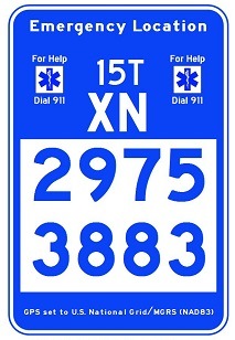 Through SharedGeo’s efforts, it has been determined that both these problems can be solved by using a sign design that leverages the U.S. National Grid (USNG) – the U.S. portion of the worldwide Military Grid Reference System (MGRS) – and which conforms to various national and international display standards. The result of this marker design effort, now known as a USNG Emergency Location Marker (ELM), is shown to the left and above. Because this sign style provides for the report of an emergency location based on a GPS coordinate system (USNG), response efforts are significantly enhanced.