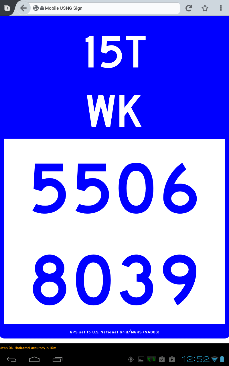 Provided the URL has been saved in the mobile platform’s browser, the display will operate dynamically and does not require an Internet connection. Per the graphic to the left, the generated location display will closely mimic the appearance of an USNG ELM. And, so long as the mobile platform’s browser is left open, the location display will be continuously updated, just as would be the case with a GPS unit.